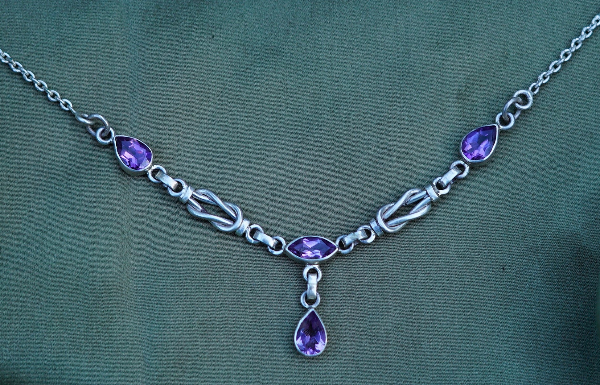 Sharvari (शर्वरी), meaning "twilight" or "nightfall." A handcrafted necklace features genuine amethyst gemstone, radiating peaceful energy and spiritual protection.